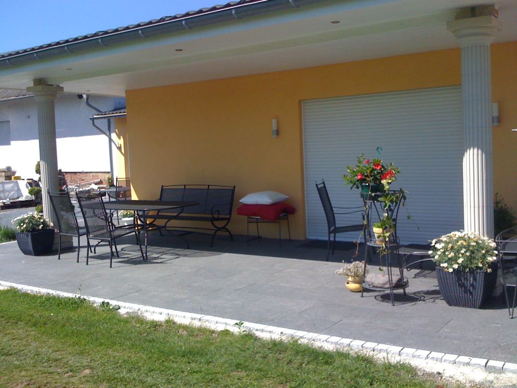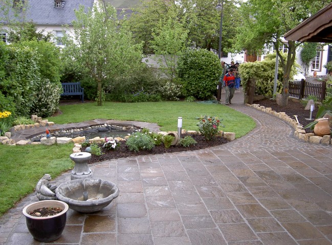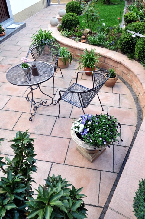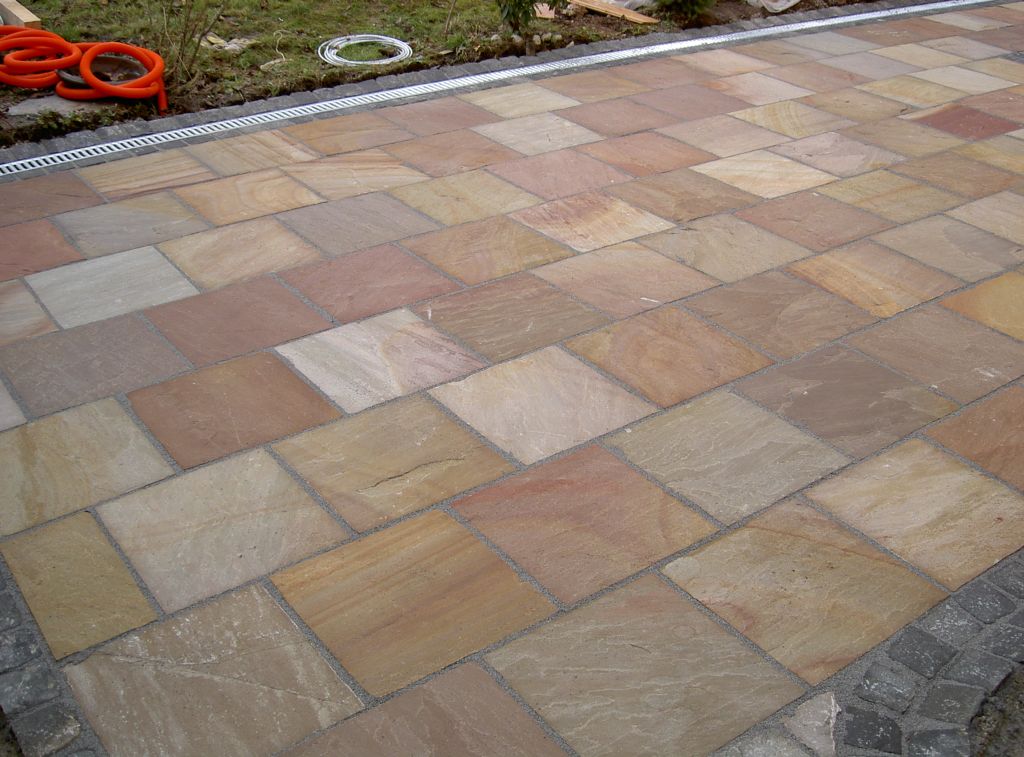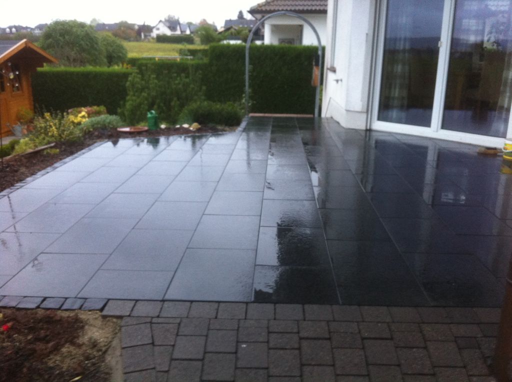 Terrasse und Mauer sind aus Indira Natursteinplatten. Die Fugen sind mit Kunststoffmörtel verfugt.