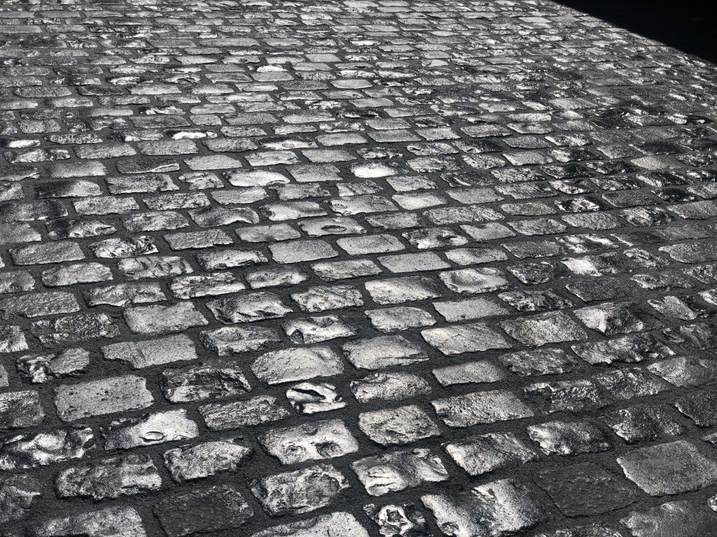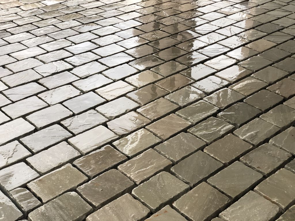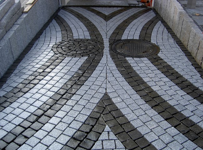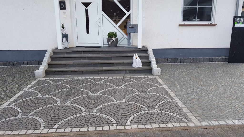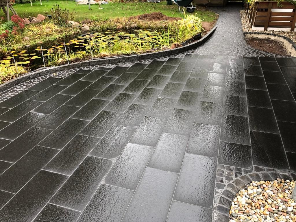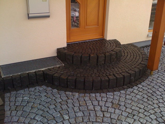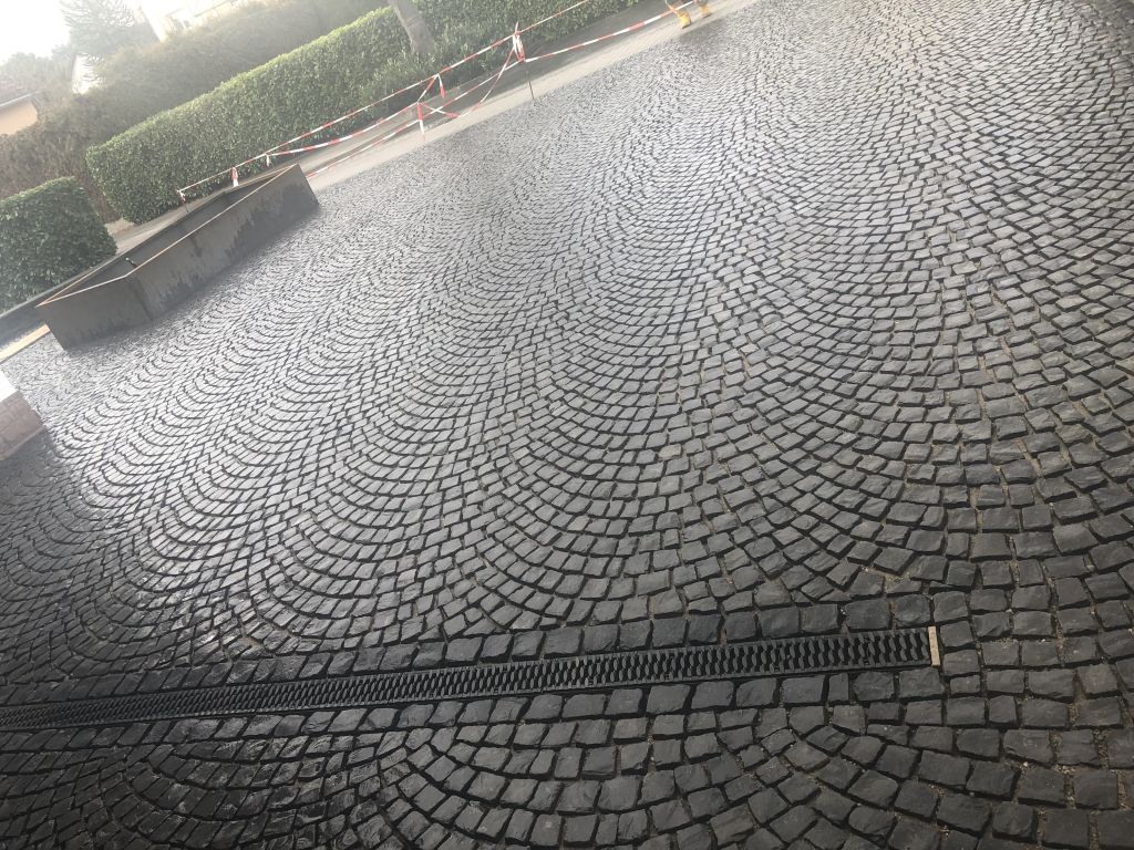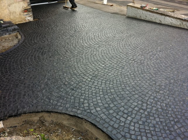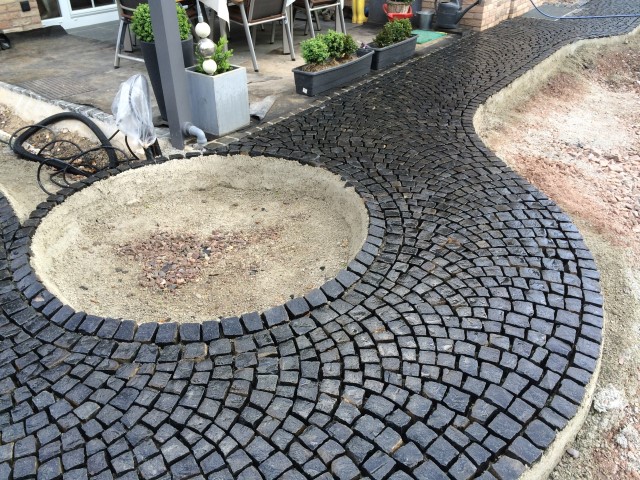 Basalt Kleinpflaster in Bogenform verlegt und mit Kunststoffmörtel verfugt.