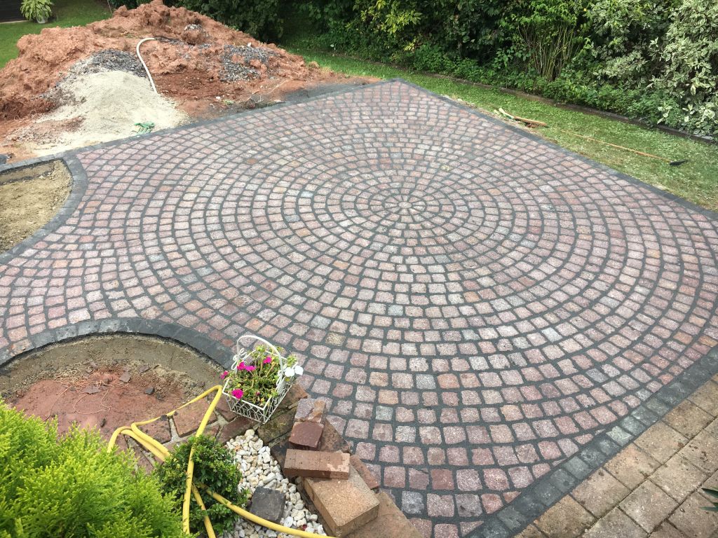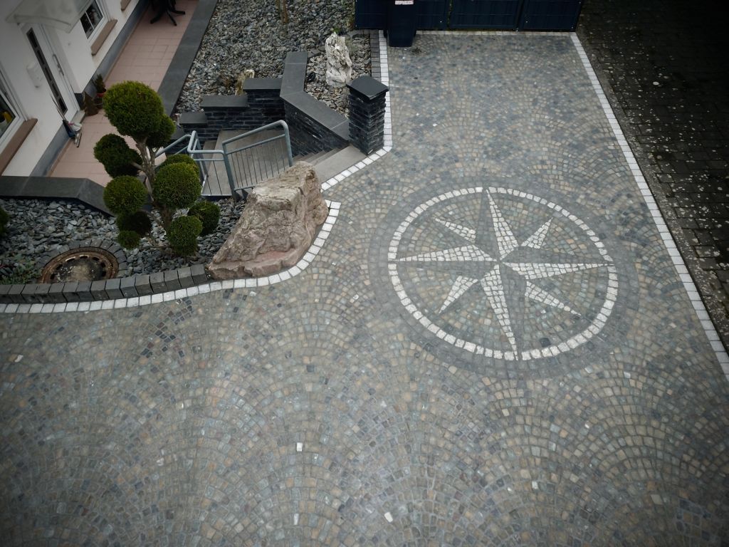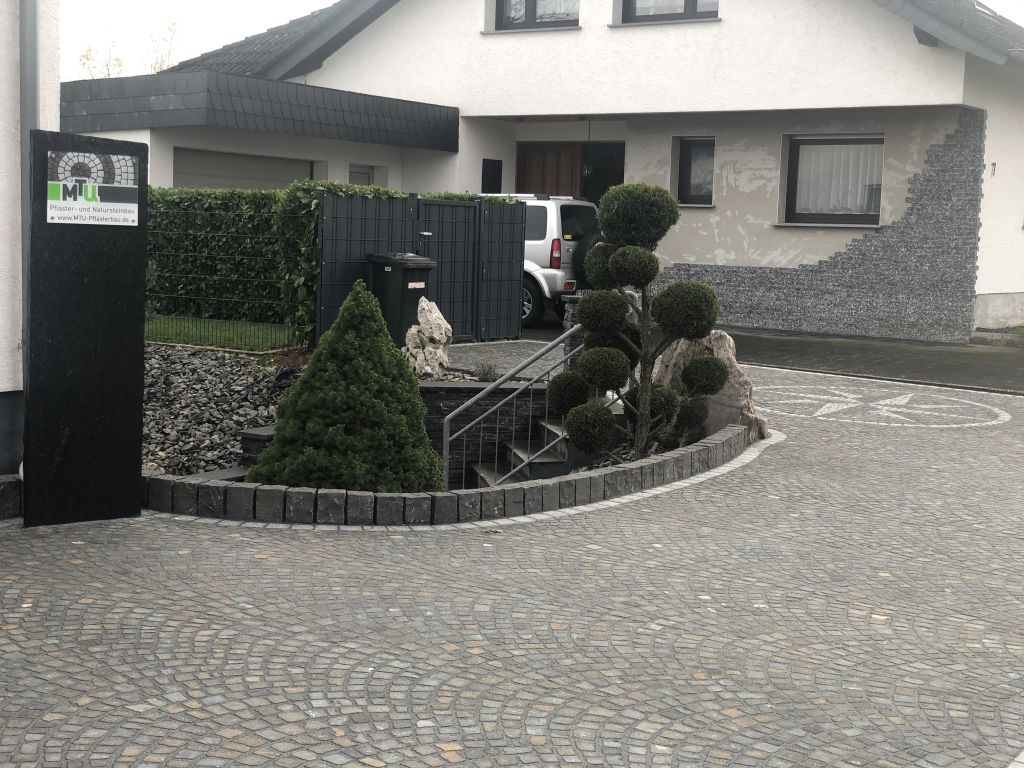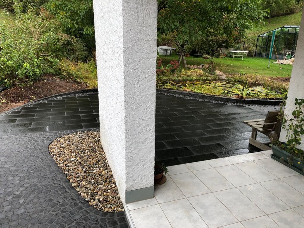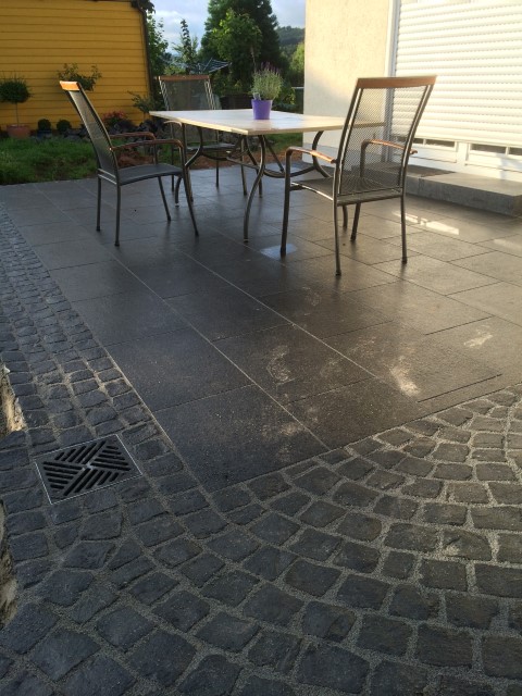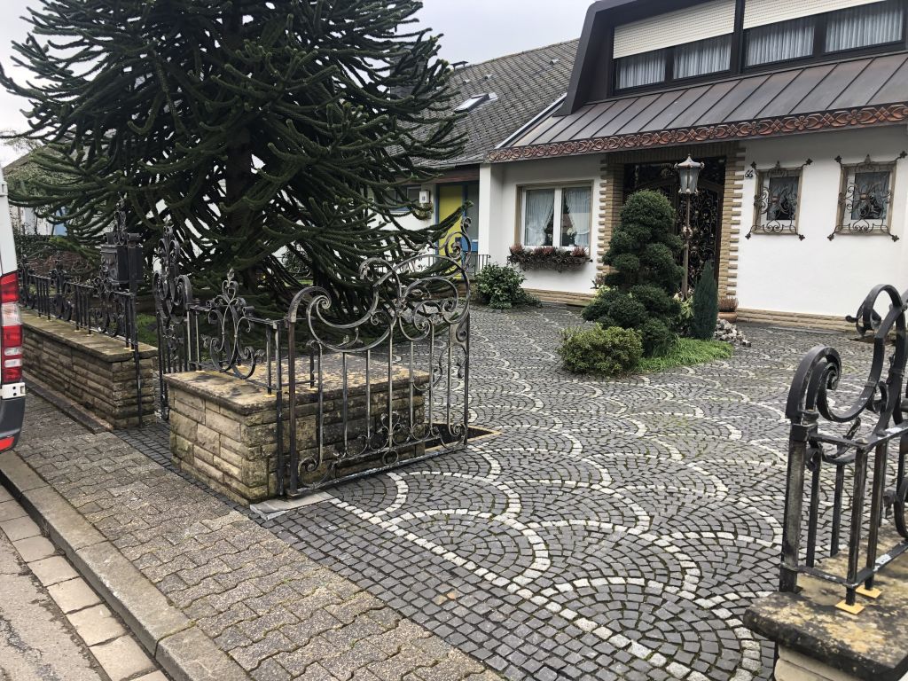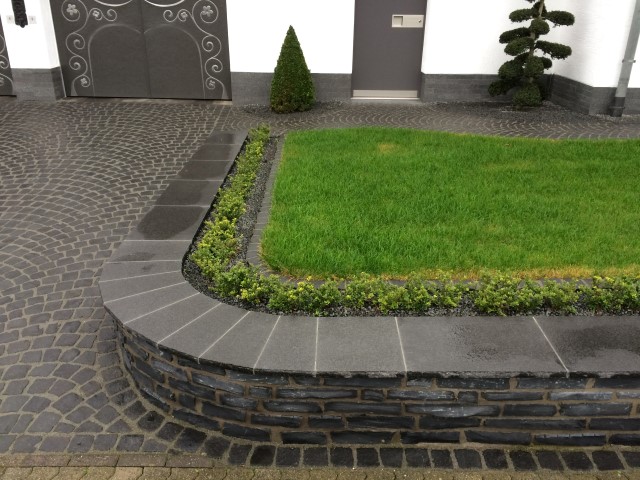 Hoffläche aus Basalt Kleinpflaster in Segmentbogen verlegt und mit Kunststoffmörtel verfugt.
