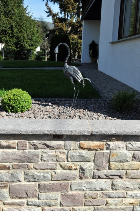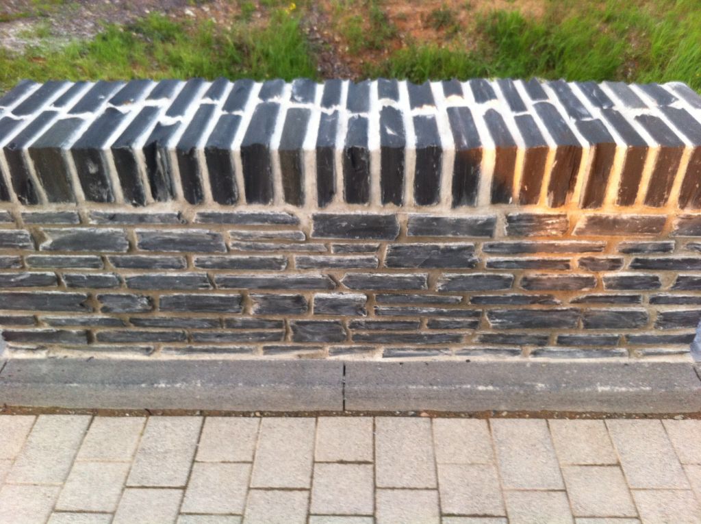 Regelmäßiges Schichtmauerwerk aus Schiefer Naturstein. Die Fugen sind mit Trasszementmörtel verfugt. Basalt Naturstein als Mauerabdeckung.