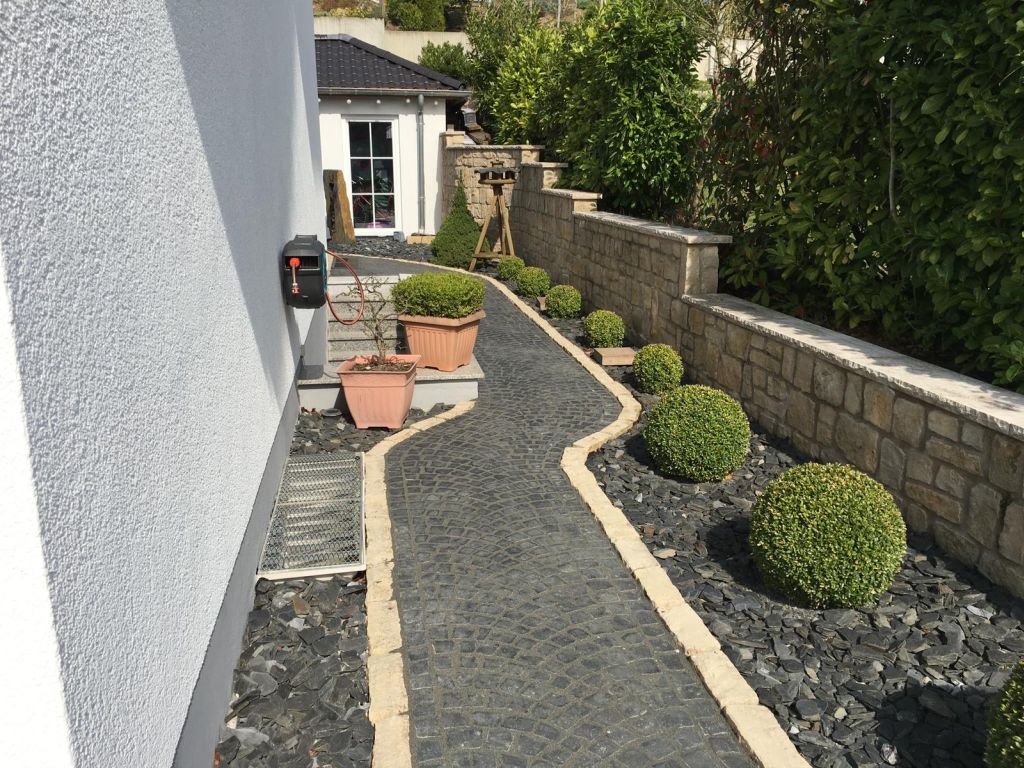 Treppe aus Basaltpalisaden und Mosaikpflaster; Fußweg aus Granit Kleinpflaster